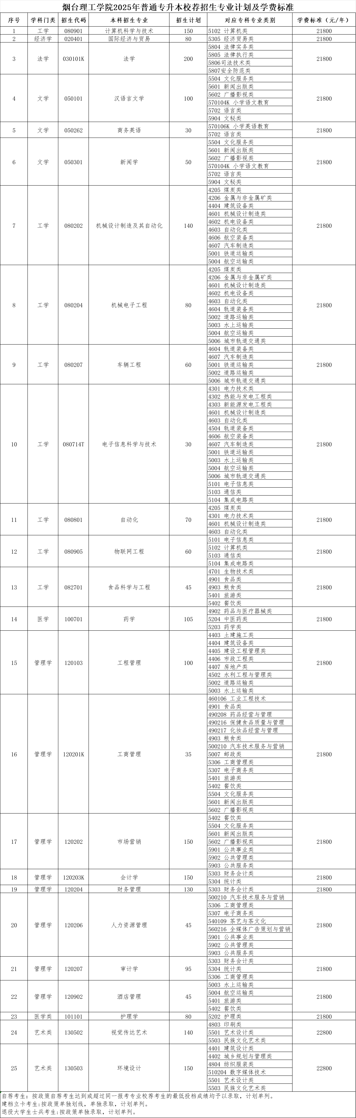【高考升学】烟台理工学院2025年普通专升本校荐招生专业计划